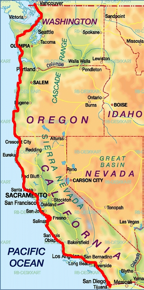 Andrew's main route will follow the 101 highway through Washington to the coast, then follow the 101 as it travels down the Washington coast, the Oregon coast, and the Northern California coast. Near the drive-through tree in the Redwoods Andrew will split off from the 101 and take the 1 highway as it reaches the coast where it travels across the Golden Gate bridge, through Big Sur, down the middle of Los Angeles, and straight down to the Mexican border.